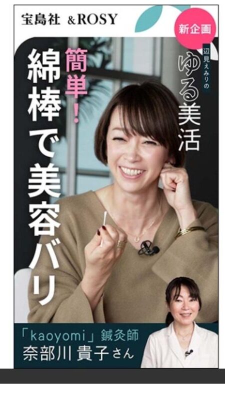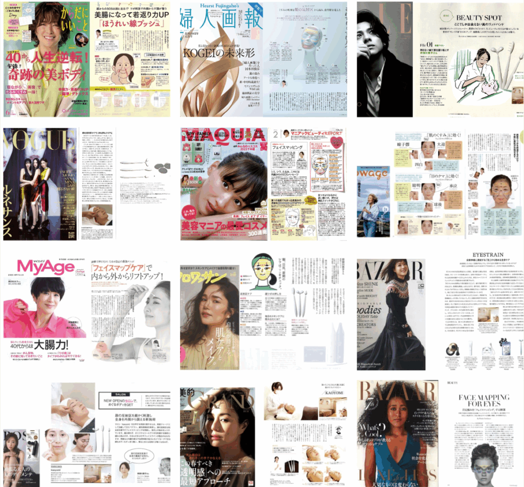 フェイシャルヘルスメソッドの施術は2015年からプライベートサロンで7年、その後東京都渋谷区のKAOYOMI サロンとKAOYOMI 出張鍼灸により2年、計9年間で数百人に実践されてきました。また、サロンは数多くのメディアや著名人のSNS(以下左:辺見えみりさん動画)に取り上げられ、メソッドは百貨店内ワークショップやセミナーとして展開。