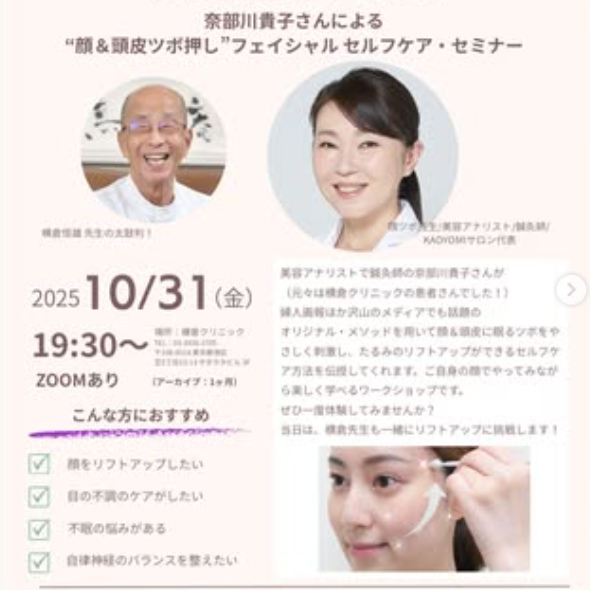 2025年10月31日、東京・港区の横倉クリニックにて、「更年期からの顔のたるみケア」をテーマにした特別セミナーを開催いたしました。今回は、クリニックの院長である横倉恒雄先生にもご同席いただき、更年期世代が抱える切実な悩み(たるみ、不眠、自律神経の乱れ)に応えるためのセルフケアを伝授いたしました。